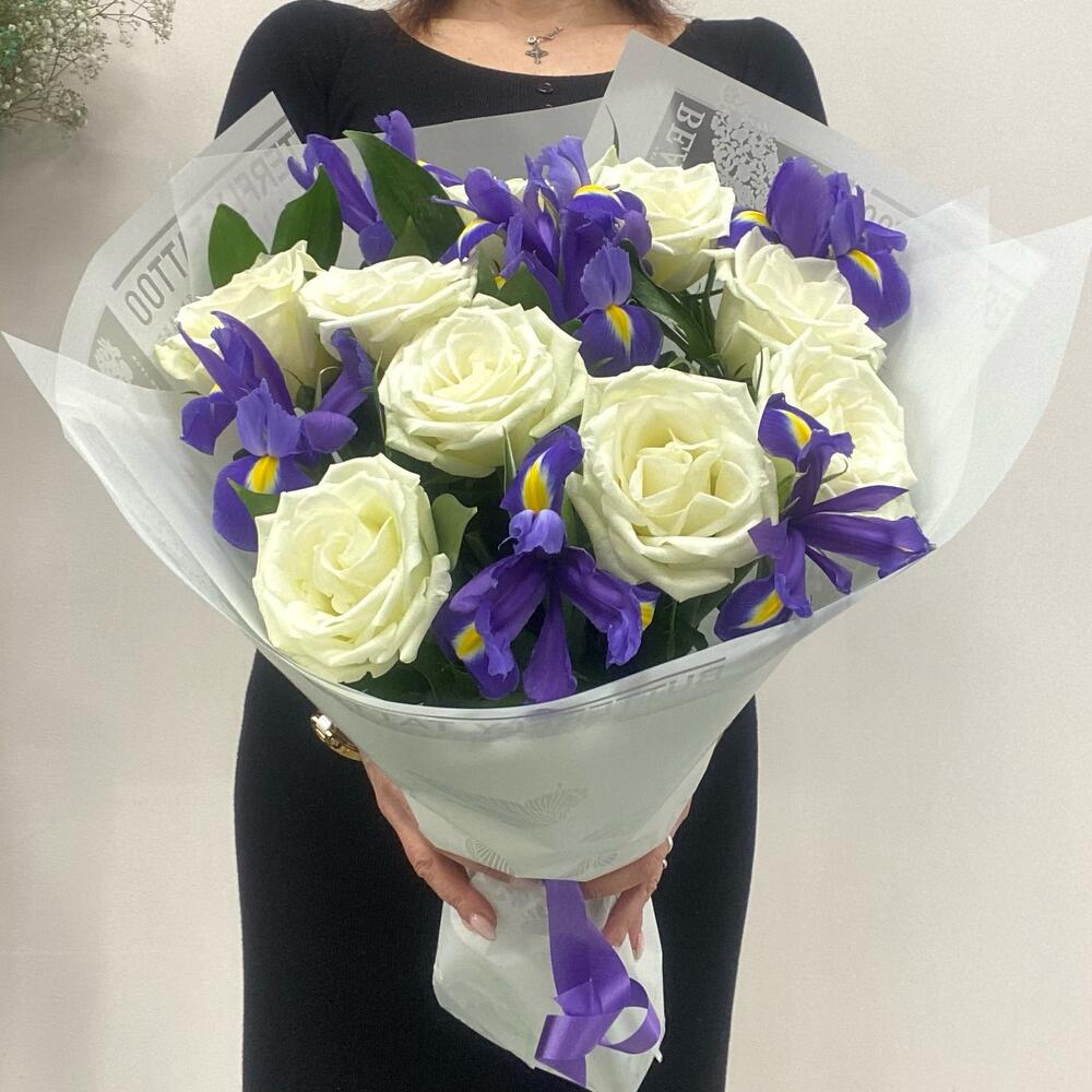 розы - 9 шт.ирисы - 6 шт.Рускус сочи - 9 шт.Упаковка дизайнерская - 1 шт.Лента - 1 шт.